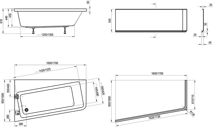 - аксессуары: передняя панель, сточный комплект для ванны