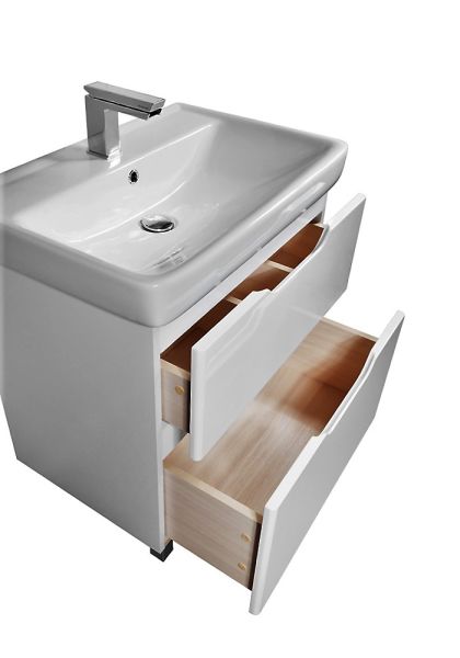 Напольная классическая коллекция в 4-х размерах с 2-мя выдвижными ящиками с доводчиками Hettich Комплектуется ножками ( 2 хромированные, 2 белые + крепления) Возможна комплектация зеркальным шкафом, пеналом, полупеналом. Верхний ящик с органайзером