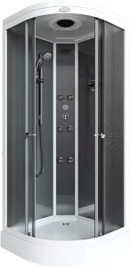 поддон низкий 15см фронтальные стекла ма фактурные задние стекла матовые «серебро» центральная панель стекло матовое «серебро» белый алюминиевый профиль регулируемые ролики хром. ручки для дверей 3-х реж. смеситель ручная лейка на штанге 6 гидромас. форсунок верхняя лейка «тропический душ» стеклянная полка слив нажимной «click-clack» с сифоном