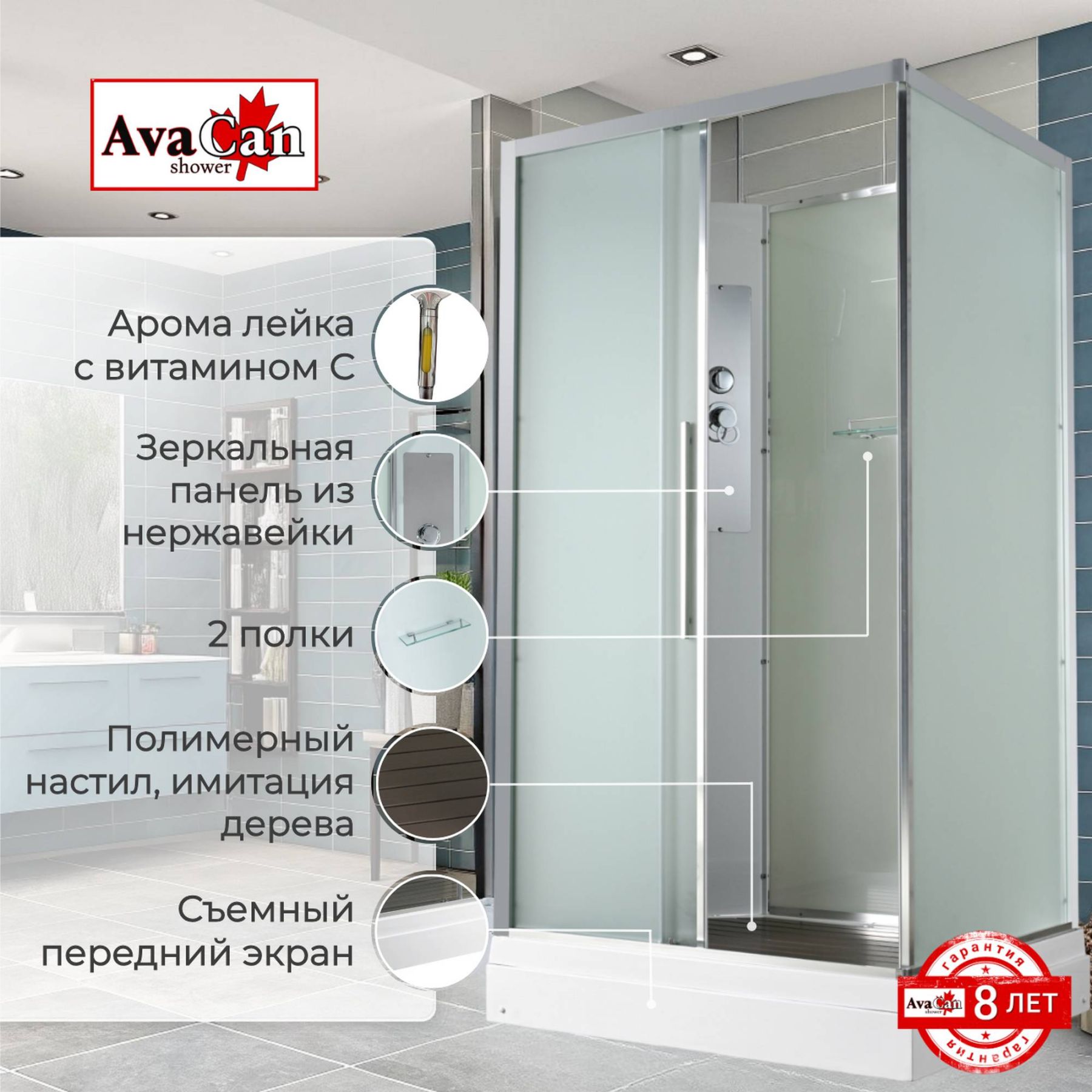 Стильная душевая кабина AvaCan сочетает в себе высокую функциональность, практичность и надежность. При изготовлении применяется безопасное закаленное стекло, надежно фиксируемое алюминиевым профилем. Профиль сделан из алюминия повышенной прочности. Сборка без силикона (увеличивает срок службы, защищает от протечек), внутренняя сборка (облегчает установку и ревизию; позволяет установить в ограниченном пространстве и обойтись без демонтажа других сантехнических приборов), смеситель резьбовой (без хомутов). Съемный экран поддона (позволяет осуществлять подключение и ревизию сифона).Двойные металлические ролики дверей (распределение нагрузки на два ролика, увеличивают срок службы). Душевая штанга(позволяет регулировать по высоте ручную лейку), ручная арома-лейка с витамином С (картридж в комплекте,есть возможность замены или удаления картриджа), полочки(из стекла, с ограничителем), сифон с гидрозатвором.