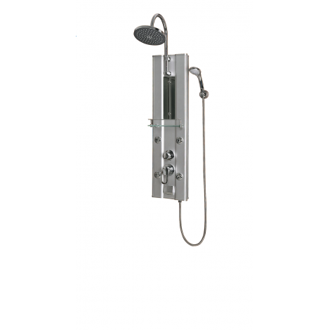 ~ панель серебристая ~ полочка ~ зеркало ~ смеситель с переключ. режимов ~ верхний душ, ~ ручной душ 3-х режим. ~ держатель руч.душа ~ г/м форс.4шт ~ набор воды ~ высота 100 см + 24 см верхний душ