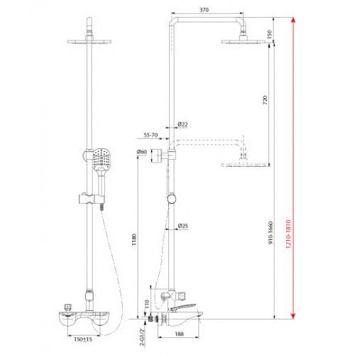 Смеситель для ванны и душа с регулируемой высотой штанги, монолитным изливом и верхней душевой лейкой «Тропический дождь»