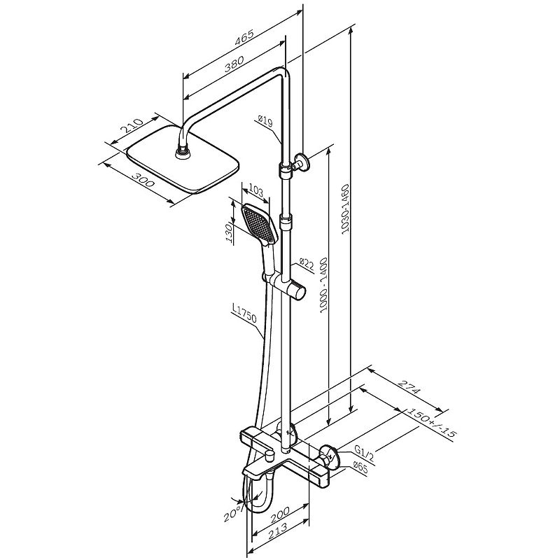 Комплект включает тропический верхний душ размером 300×210 мм с фиксированным выносом 380 мм для равномерного распределения воды, а также ручной душ с тремя режимами работы: Spray для мягкого потока, EnerJet для интенсивного напора и комбинированный режим Spray + Massage для массажного эффекта. Телескопическая штанга регулируется по высоте от 1030 до 1460 мм, что позволяет адаптировать систему под рост любого пользователя. Длина душевого шланга составляет 1750 мм, обеспечивая свободу движений.