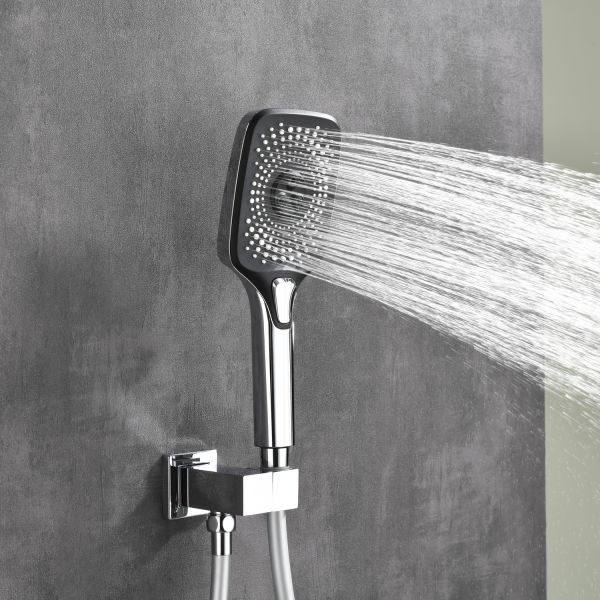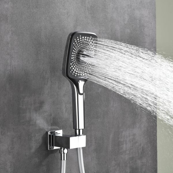 Готовое решение для душевой зоны скрытого монтажа датского производителя Black&White в цвете глянцевый хром. За управление давлением и температурой воды отвечает теромостатический смеситель постоянного потока , а для выбора режимов работы установлены две кнопки цилиндрической формы, расположенные в квадратном корпусе смесителя.Из потребителей доступен ручной душ с режимами , а также квадратная верхняя лейка на прямоугольном кронштейне. В дизайне изделия пересекаются квадратные и цилиндричсекие формы, которые гармонируют между собой создавая минималистичный облик, подходящий для большинства современных интерьеров