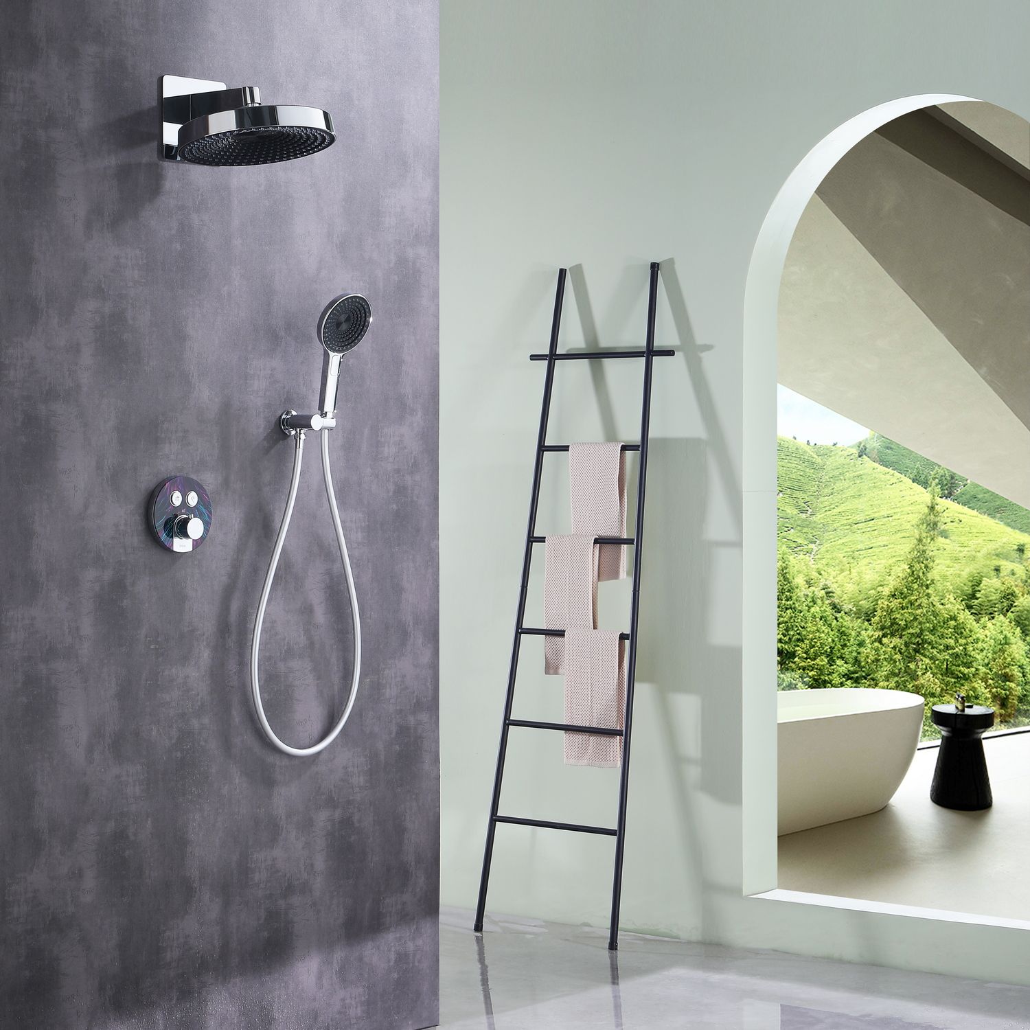 Для управления потоком воды и настройкой температуры установлен термостатический картридж прогрессивного типа с постоянным давлением, а для выбора нужного режима работы интегрированы две клавиши круглой формы. Из потребителей в комплектацию входит ручной душ с режимами, а также верхняя лейка с настенным кронштейном. Важно подчеркнуть, что в данной серии внешняя часть корпуса смесителя задекорирована вставкой под темный мрамор с разноцветными прожилками, которые акцентируют на себе внимание в любой душевой зоне.