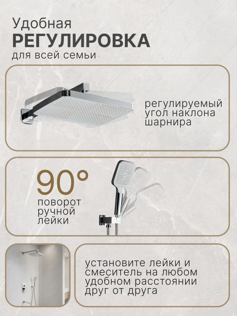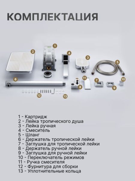Душевой комплект содержит все необходимое для монтажа. Кроме того, наша душевая стойка с дисплеем и подсветкой имеет простой и быстрый монтаж, благодаря чему вы сможете установить ее самостоятельно без привлечения специалистов. Это позволит сэкономить время и деньги, а также получить удовольствие от процесса создания своего уютного уголка в ванной комнате.