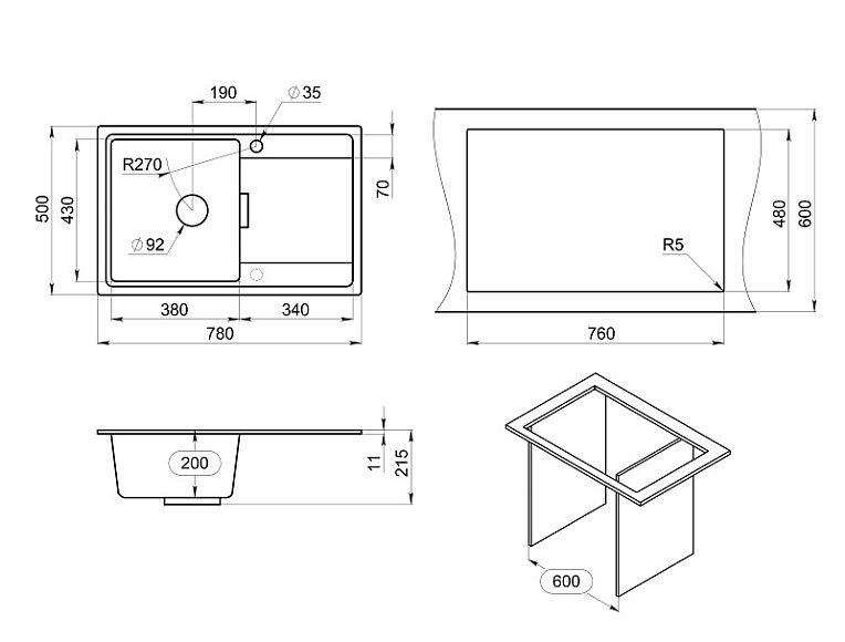 - Отверстия под смеситель:1