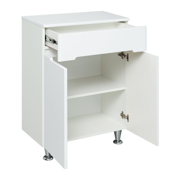 Тумба в ванную (полупенал) с одним выдвижным ящиком и двумя распашными дверками. В нижнем отделении - одна внутренняя полка. Петли со встроенным доводчиком, ящик на шариковых направляющих полного выдвижения.