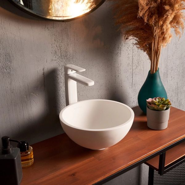 Раковина из искусственного камня для ванной комнаты, представитель линейки бестселлеров Montebianco Nemi / Nemi Due / Nemi 390. Круглой формы, оптимальной глубины – вода не выплескивается и не разбрызгивается. Имеет самый компактный диаметр чаши среди всех раковин круглой формы Montebianco – идеальна для установки в небольших помещениях или «проходных» зонах. Отличный выбор для корпоративных покупателей/коммерческих помещений. Раковина Montebianco Nemi Due устанавливается как на поверхность столешницы или мебели накладным способом, так и бесшовно вклеивается в столешницу любого цвета, создавая цельную поверхность. Уход за раковиной из искусственного камня прост: в большинстве случаев достаточно протереть поверхность влажной губкой с чистящим средством. Материал не впитывает влагу, не порист, непроницаем для плесени, бактерий и грибков. Nemi Due имеет матовую, бархатистую поверхность. Полимерный материал принимает температуру окружающей среды, поэтому в жилом пространстве данная модель раковины всегда будет приятной на ощупь. Отличие Nemi Due от Nemi и Nemi Tre – в размерах: Nemi Due имеет самую компактную чашу, при этом оптимальной глубины.