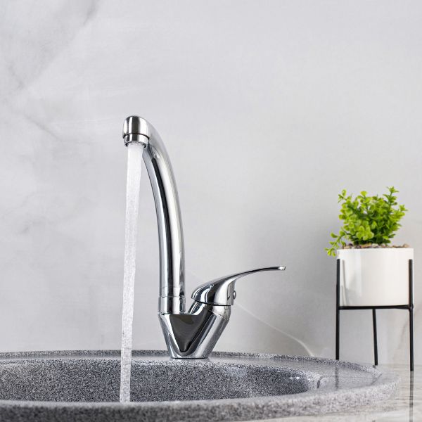 Классический однорычажный смеситель для кухни с высоким поворотным изливом обладает лаконичной ручкой регулировки температуры воды, отлично подойдет для оснащения любой раковины.