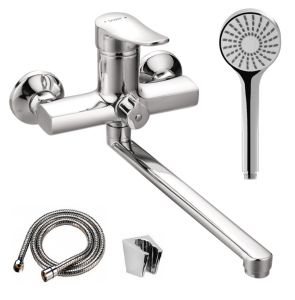 Смеситель для ванны и душа: излив поворотный, керамический картридж, в комплекте эксцентрики и декоративные розетки, душевой шланг 1500 мм, держатель (на два положения) и душевая лейка d 95 мм (1 режим).