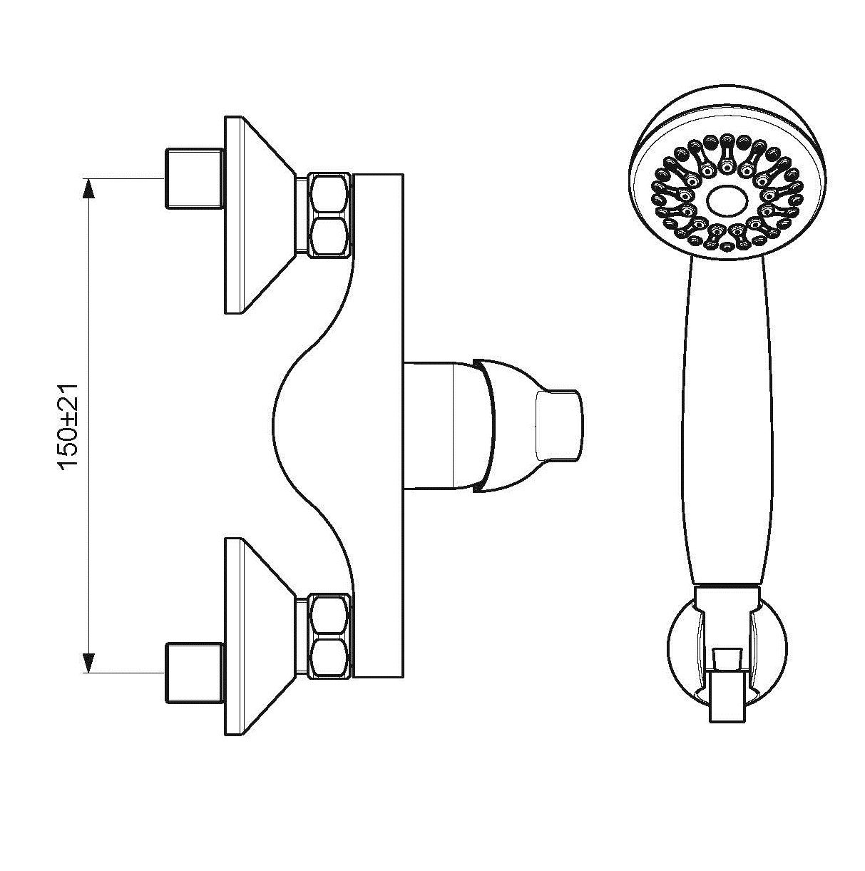 FINE Настенный смеситель для душа, душевой гарнитур в комплекте (душевая лейка 1ф. Ø70 мм, металлический шланг 1500 мм, держатель для лейки).