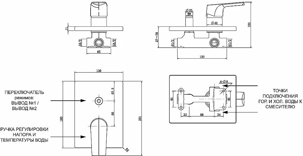 1 ходовой = 20,8 литра в минуту / 2 ходовой = 19,67 ручной душ/18,64 верхний душ литров в минуту